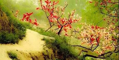 当他登上一个斜坡的时候,放眼望去,前面山重水复,路断人绝,貌似没有路,没法再前进了。但这个时候陆游的兴致正浓,不想回头,于是他沿山坡又走出了几十步,转过山脚,忽然发现前面有一片特别空旷的谷地,一个小村庄在绿柳红花之中显得特别的可爱,就好像传说中的世外桃源一样。