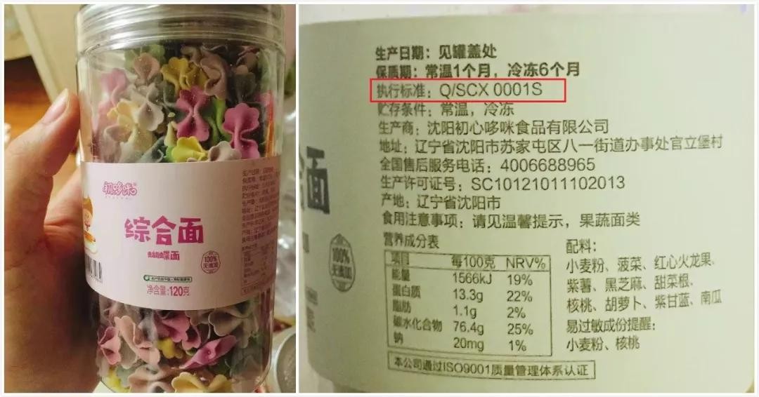 这里要先介绍一个知识:要测评食品是否合格,是看它是否符合食品外包装标明的“生产标准”。如果检测符合生产标准,那就是合格的食品。生产标准有国家标准、地区标准、行业标准、企业标准四种。婴幼儿辅食需要符合“国家标准”;但初哆咪宝宝辅食面条,全部执行的是初哆咪公司自订的企业标准“Q/SCX 0001S”。