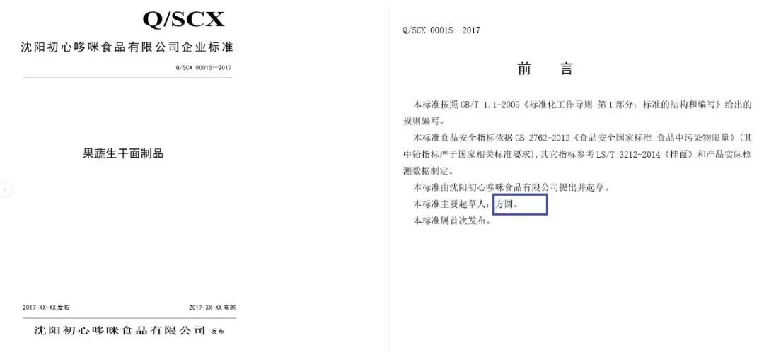 纵观初哆咪辅食面条企业标准Q/SCX 0001S,就是它“前言”里面自己说的: