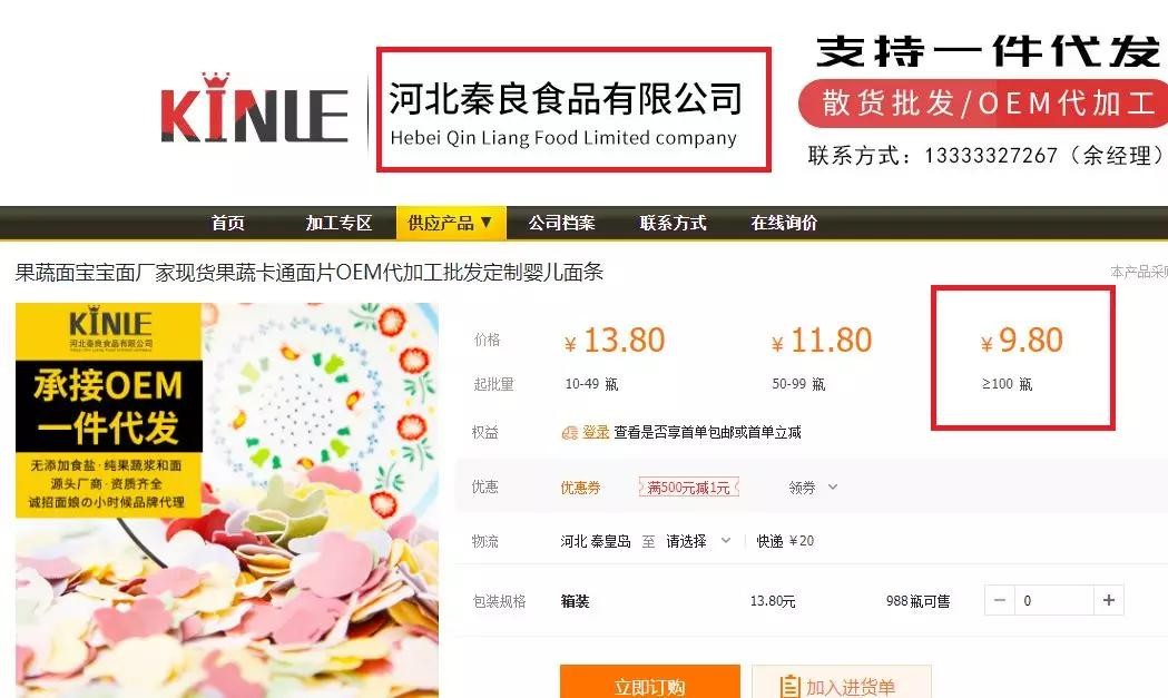 最后,讲一个凑巧的事情:因为研究初哆咪企业标准,也让我们意外的发现初哆咪近期面条的代工厂。代工厂卖9.8元的面条,初哆咪的价格是29.8元,3倍!