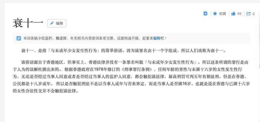 衰十一,是指「与未成年少女发生性行为」的简单俗语。因为该罪名由十一个字组成,所以人们戏称为衰十一。 该俗语源自于香港地区,但事实上,香港法律并没有一条罪名叫做「与未成年少女发生性行为」。所以这条所谓的罪行是由于人为的误解杜撰出来的。 根据香港政府在1978年修订的《刑事罪行条例》,任何年龄的男性与未满十六岁的女性发生性行为,无论是否经过当事人同意或者是否经过当事人的监护人同意,都会触犯该法律,最高刑罚可判五年有期徒刑。