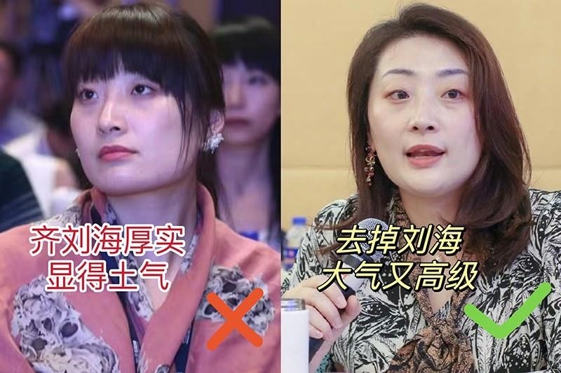 “刘海”是改变脸部印象的重点元素之一。宗馥莉摒弃了厚重的齐刘海,采用了趋于自然、偏分的刘海设计。这样的改变不仅缓和了脸部线条,也提升了整体造型的档次感。同时,我们也需要根据自己的脸型来判断,到底是选择“二八分”还是“三七分”的偏分刘海!