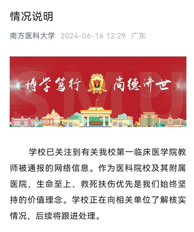 6 月 16 日中午,南方医科大学微信公众号发布一则 " 情况说明 ": 学校已关注到有关我校第一临床医学院教师被通报的网络信息。作为医科院校及其附属医院,生命至上、救死扶伤优先是我们始终坚持的价值理念。学校正在向相关单位了解核实情况,后续将跟进处理。
