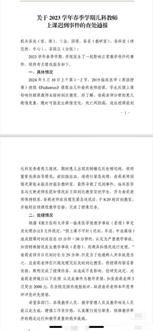 据网传的 " 关于 2023 学年春季学期儿科教师上课迟到事件的查处通报 " 文件显示:2024 年 5 月 10 日上午第 1-2 节,2019 临床医学(英语授课)班级《Pediatrics》课程由儿科俞莉老师授课,学生反馈上课铃响但授课老师未按时到达教室。