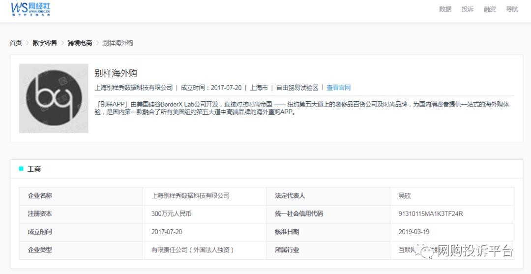 从网经社企业库(COP.100EC.CN)了解,别样海外购隶属于上海别样秀数据科技有限公司,该公司成立于2017年7月20日,位于上海市浦东新区,法定代表人为吴欣。据官网显示,“别样海外购”称采用的是直邮模式,当消费者在APP上下单时,“别样”开发的智能机器人会帮消费者直接在商场和品牌的官网上下单,订单成功后,货品由海外商家直接邮寄到消费者手中。