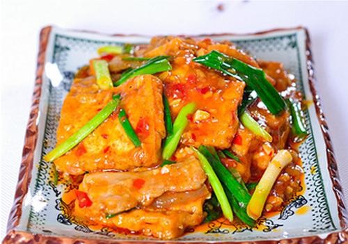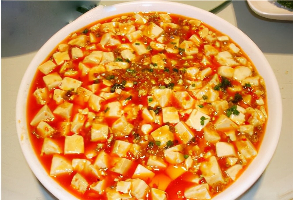 麻婆豆腐是中国豆腐菜肴中最富地方风味特色菜之一,此菜的特色是以“烧”法烹之,在雪白细嫩的豆腐上、点缀着棕红色的牛肉末和油绿的青蒜苗,外围一圈透亮的红油,如玉镶琥珀,具有麻、辣、烫、嫩、酥、香、鲜的独特风味。