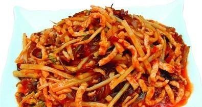 1、猪肉切成长约7厘米、0.3厘米粗的丝,加盐、水豆粉拌匀。