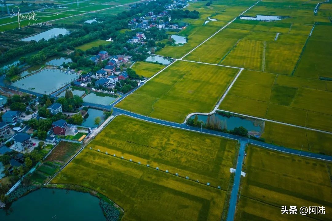航拍视角下,秋意渐起的田园风光已有青黄交接的颜色,环抱着当地的村落民居和鱼塘沟堑,由数条干净利落的乡间小道串连起来,把杭州特色的田园风景衬托得分外旖旎。