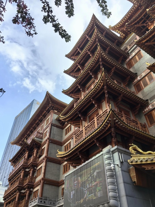 大佛寺被一群高楼大厦环绕,周边是熙熙攘攘的商业街,到处弥漫着现代化的气息。大佛寺在现代化的建筑群里显得特别的突出,大佛寺的建筑风格是中国古建筑风格!