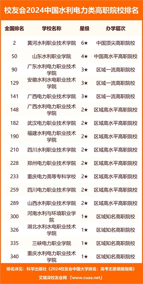 黄河水利职业技术学院、山东水利职业学院、广东水利电力职业技术学院位居校友会2024中国水利电力类高职院校排名前三强。