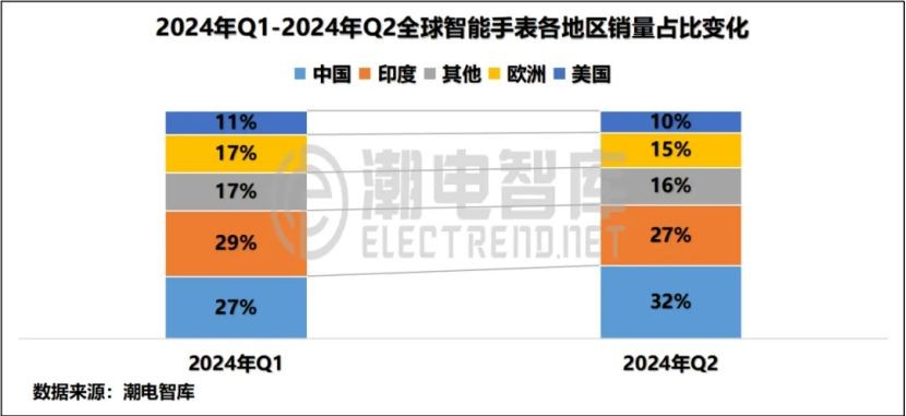 在潮电智库发布的2024年Q2中国畅销智能手表市场分析简报中,可以看到上半年智能手表同比下降3%。根据2024年Q2季度与2024年Q1季度的数据对比来看,Q2季度印度地区比较上个季度份额下降2%;中国地区的份额占比由上个季度27%上升到32%,相比其他地区增幅最大。