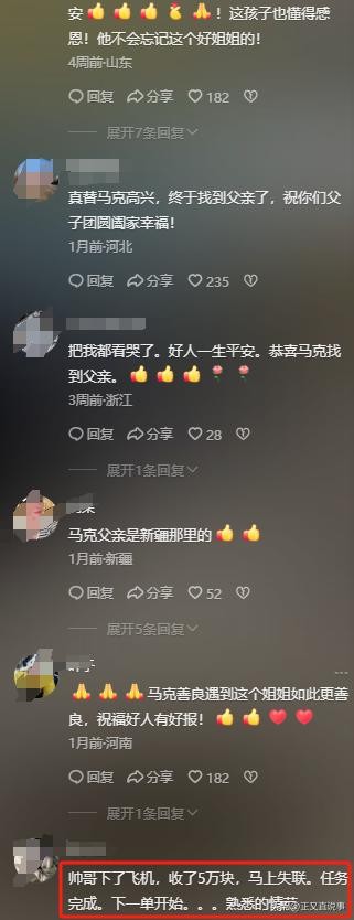 但在无数的点赞下面有一个不同的声音吸引了大家的眼球,网友表示,帅哥收了5万块,马上失联,任务完成,下一单开始,这样的情节好像似曾相识。