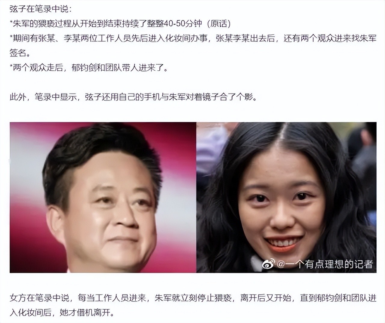 另外,在朱军回应之余,该记者的其他调查,也值得放在一起详细揣摩,首先是弦子和朱军两人的笔录,在笔录中,两人的说法迥然不同,弦子表示朱军对其猥亵过程从开始到结束持续了整整40-50分钟,途中,有两位工作人员、两位观众以及郁钧剑和其团队先后进入,每次有人进入,朱军就暂停,人一走就继续。
