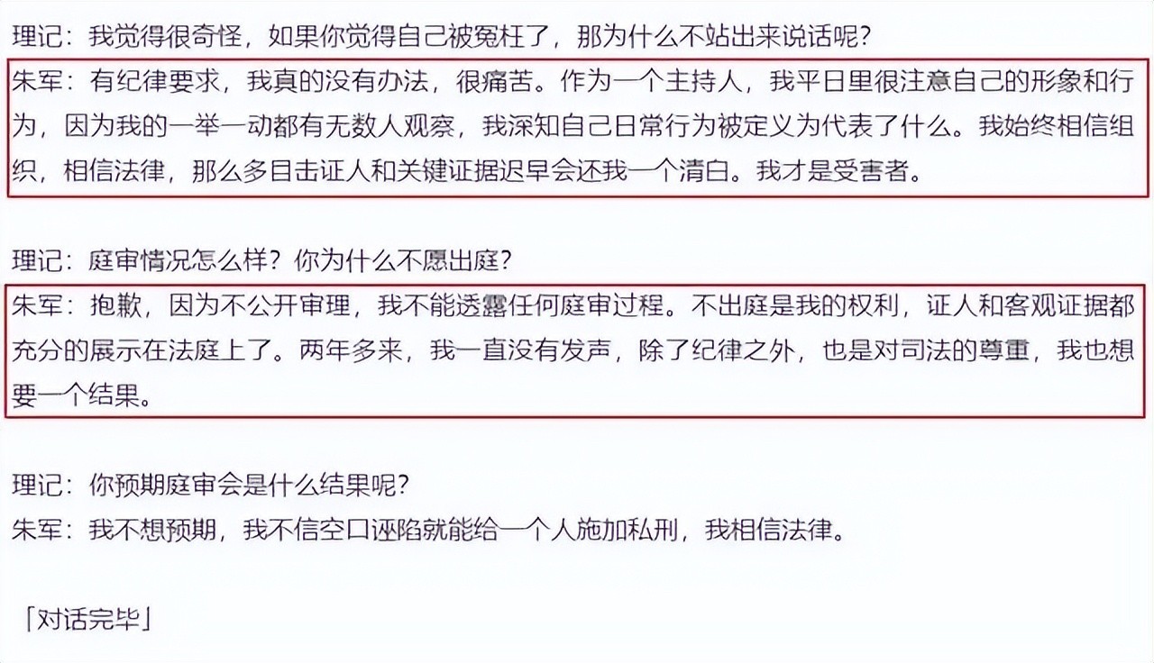 最后,朱军自认是受害者,也表态相信法律迟早会给自己一个清白,至于庭审情况,朱军以不公开审理的因素拒绝了透露。
