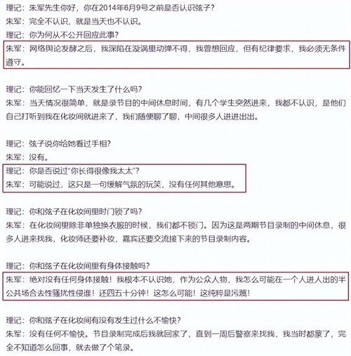 首先,在记者对朱军的采访中,朱军明确表示在案发前完全不认识弦子,包括案发当天也不认识,之所以不回应,是被纪律要求所限制,其次,朱军虽然承认可能对弦子说过一句“你长得很像我太太”的话,但朱军表示这只是为了缓解气氛,也否认与弦子有肢体接触,包括在当时被警察找上门时,朱军仍然不知道发生了什么事情。