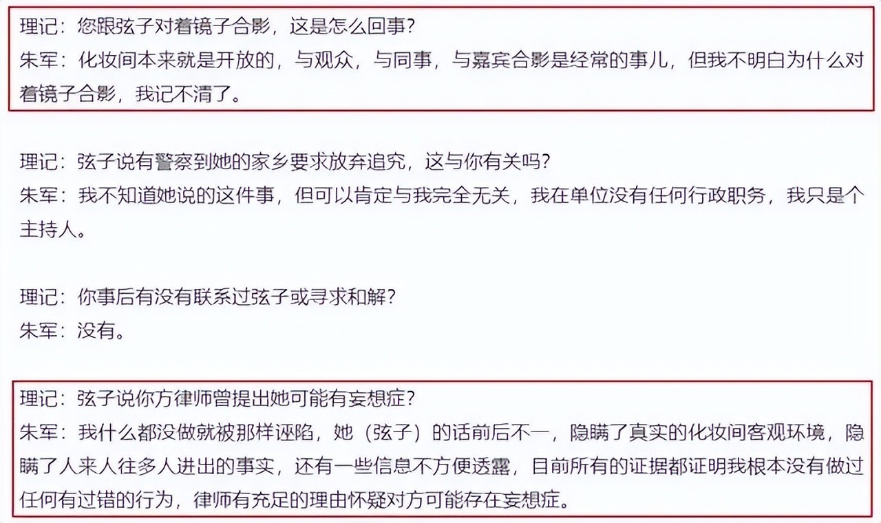 针对颇有争议的合影事件,朱军的回答是人与人之间正常的交流,只是为什么会对着镜子合影,朱军表示记不清了,此外,对于律师提到弦子有妄想症的说法,朱军表示弦子说话前后不一,隐瞒了真实的化妆间客观环境和人来人往的事实,故而才有此怀疑。