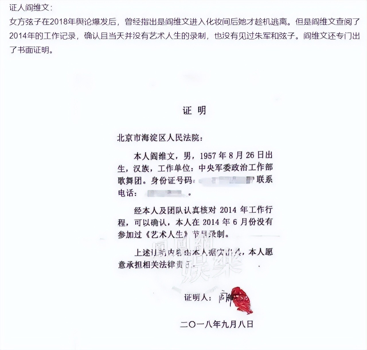 其实这些因素叠加到了一起,此事就已经显得疑点重重了,而且,该记者在文章中,也描写了弦子曾在微博中指出是阎维文进入化妆间后她才趁机逃离,但实际上,当天出入化妆间的郁钧剑,阎维文不仅没有参加录制,后续也出具了书面证明,只不过,后续弦子在笔录中又改口说了是郁钧剑。