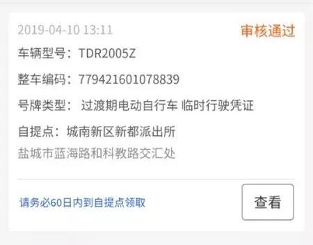 5、审核通过后点击“查看”,请在审核通过10日后60日内到选择的“自提点”,凭二维码领取号牌