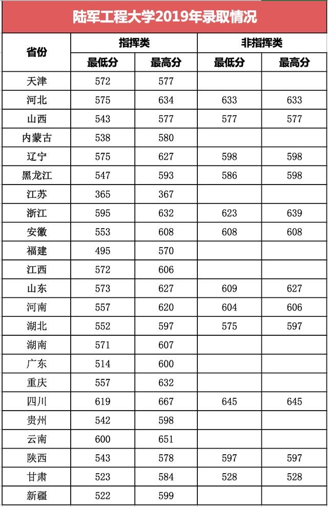2、陆军工程大学2019年在各地录取分数线