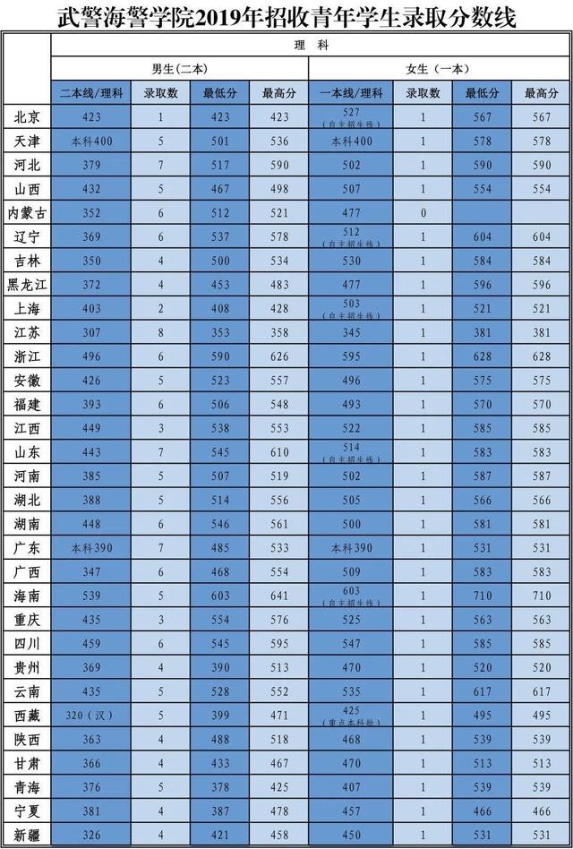 27、武警海警学院2019年在各地录取分数线: