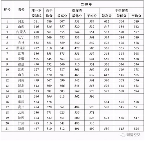 19、空军预警学院2018-2019年在各地录取分数线: