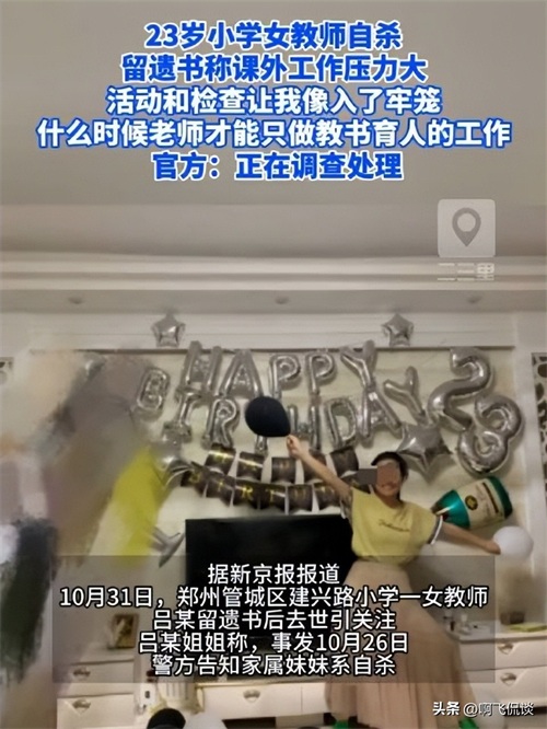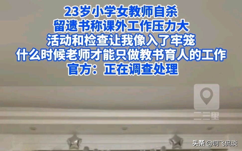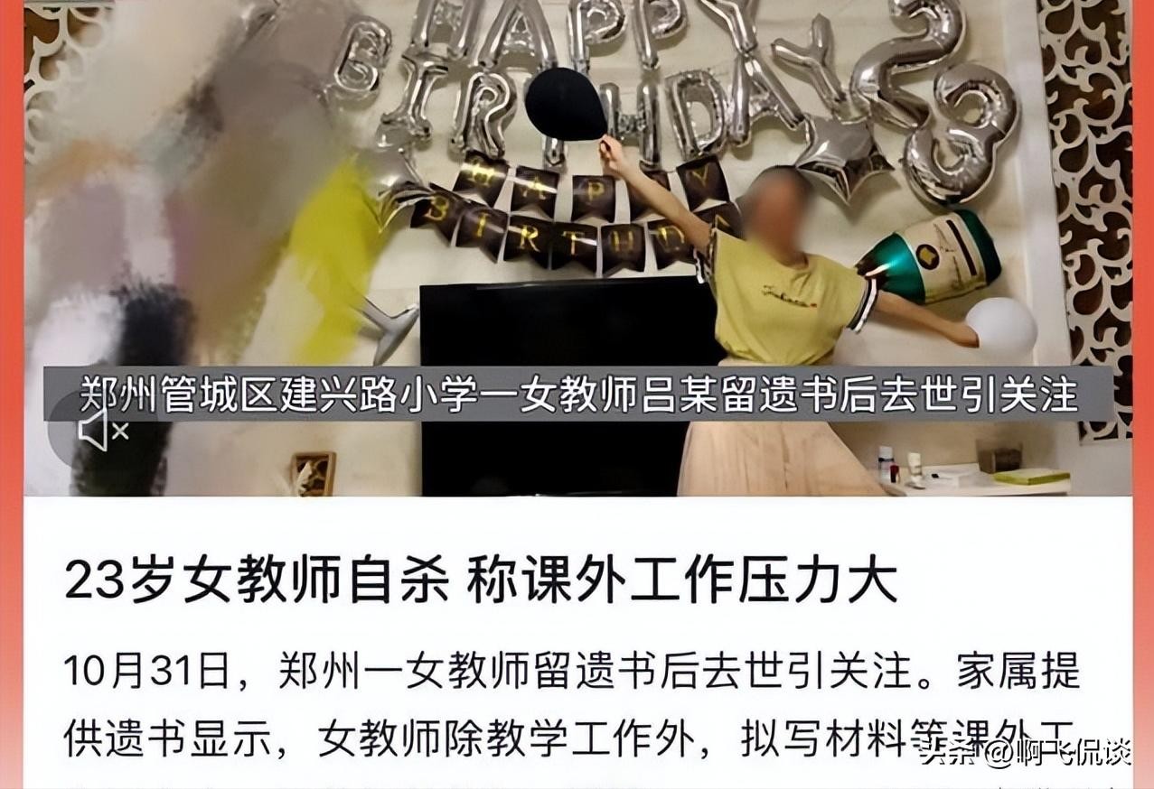 教育体系下的悲剧。这位年仅23岁的小学女教师,在遗书中留下了深深的无奈和痛苦。她抱怨课外工作压力太大,活动和检查使她感到像是被困在了无法逃脱的囹圄中。她的离世呐喊着一个问题:究竟何时,老师们才能专心致志地进行教书育人的工作,而不必背负如此沉重的压力?
