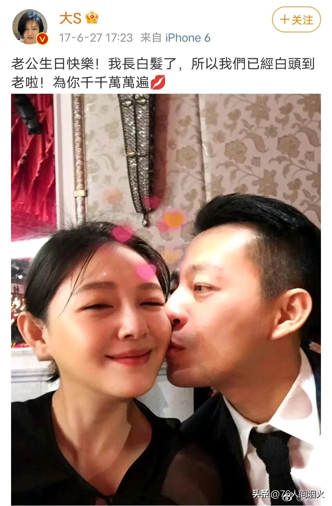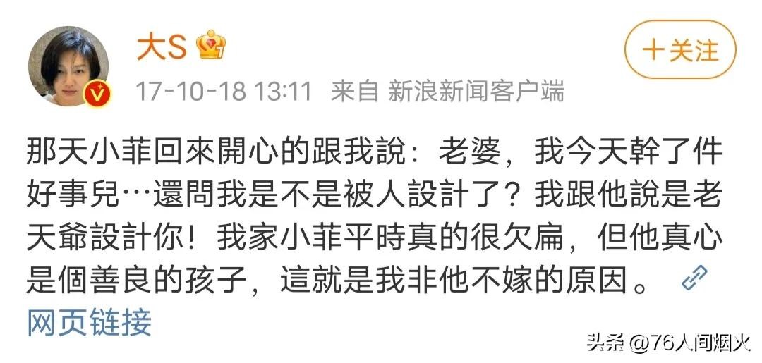 顺便翻看了大S旧时微博,除掉宣传或者祝福朋友的,剩下的几乎都是她和汪小菲的恩爱点滴,那时,他们是真心相爱。大S在微博里说,我们家小菲平时是真的很欠扁,但他真心是个善良的孩子,这就是我非他不嫁的原因。