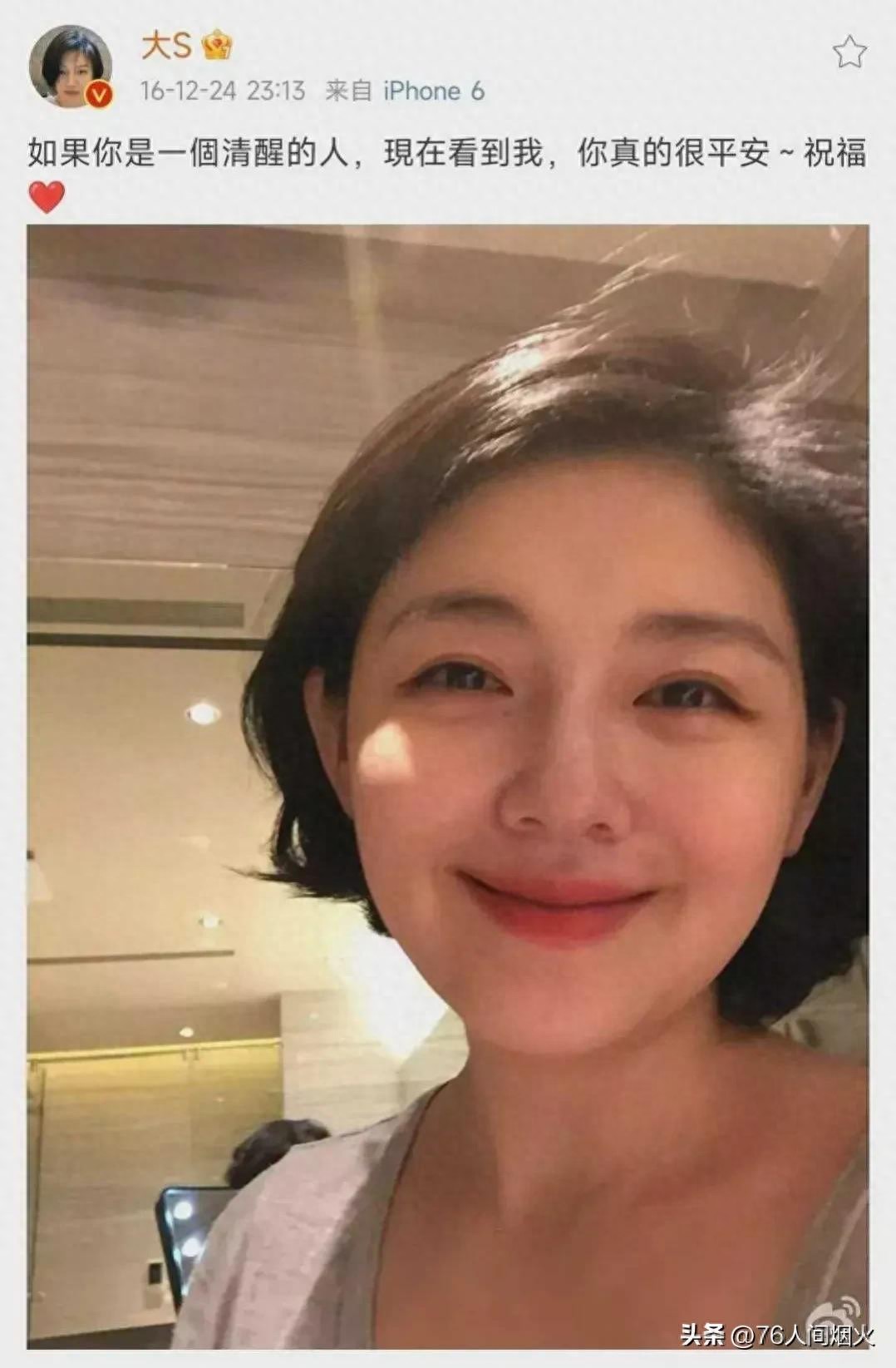 在某易看到有个博主发大S旧闻,原来是16年的平安夜大S晒照并配文,如果你是一个清醒的人,现在看到我,你真的很平安。