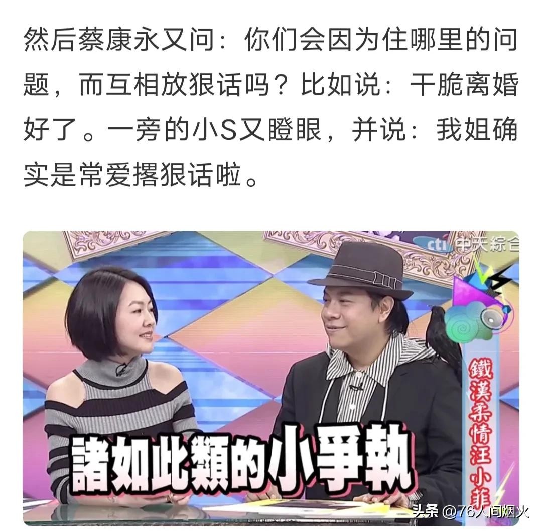 大S在12年时候就表示北京气候太干,所以不愿意住北京,后来带孩子回台北,汪小菲就只能北京台北来回跑,蔡康永在节目上曾经问过他们住哪里产生过矛盾吗?