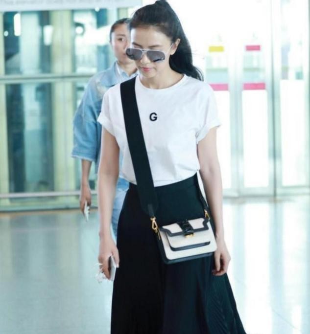 白T恤搭配黑色半裙,简洁又活力的一套搭配。白T恤总是可以让穿着者显得更加活力灵动,更有朝气感,深色的半裙自带个性气场之美,二者搭配之下风格鲜明,但也足够简约大方。高圆圆留着利落的高马尾发,整个人显得帅气清新,时尚活力又有精致感。