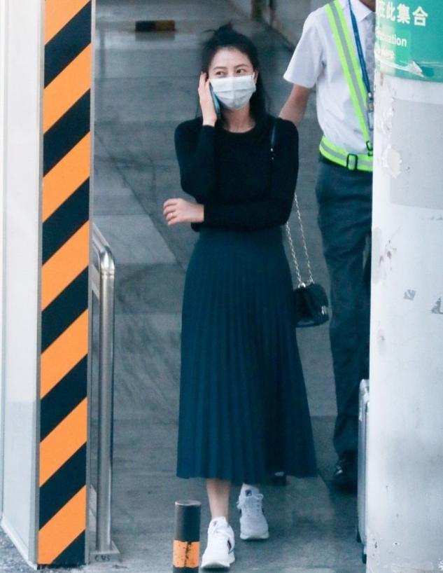 黑色上衣搭配蓝色百褶裙,高圆圆搭配了丸子头和运动鞋,整个人显得很活力。百褶裙又让整套造型显得复古优雅,足以展现高圆圆的精致感,整个人也显得很时髦,个性又优雅。