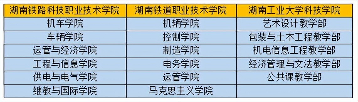 为便于对比分析铁道类、交通类高校办学特色,笔者随机选取了石家庄铁道大学、重庆交通大学、华中交通大学这三所高校作为分析样本。根据官网资料整理,三所高校学院划分门类齐全,涵盖工、文、经、管、法、教育等专业,是典型的综合办学院校。同时,三所高校均设有土木、建筑、电气、信息等轨道交通学科相关学院,可以肯定地讲这三所高校毕业的学生,可以从事轨道交通研发、设计、施工、建设、运维全产业链职业,与湖南铁道职业技术学院、湖南铁路科技职业技术学院办学形成鲜明对比。