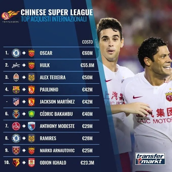 中超联赛自从成立以来,要数大牌外援加盟的,是从恒大引进当时的巴甲MVP孔卡开始的,当时恒大花费了1000万美金的转会费将孔卡带到中超,也创下了当时中超转会新高。而首次破亿(人民币)引援也属于恒大,当时恒大花费1500万欧元引进巴甲克鲁塞罗双子星之一的高拉特,将中超转会费纪录再次推高。从此,中超球队引援上亿元比比皆是,直到上港花费6000万欧元将奥斯卡从切尔西带到上海,成为了至今为止中超的最贵外援。