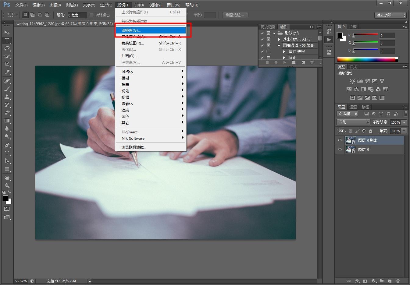 首先导入准备好的照片,保险起见可以先复制一个新图层,然后选中图层,找到【滤镜-滤镜库】功能。
