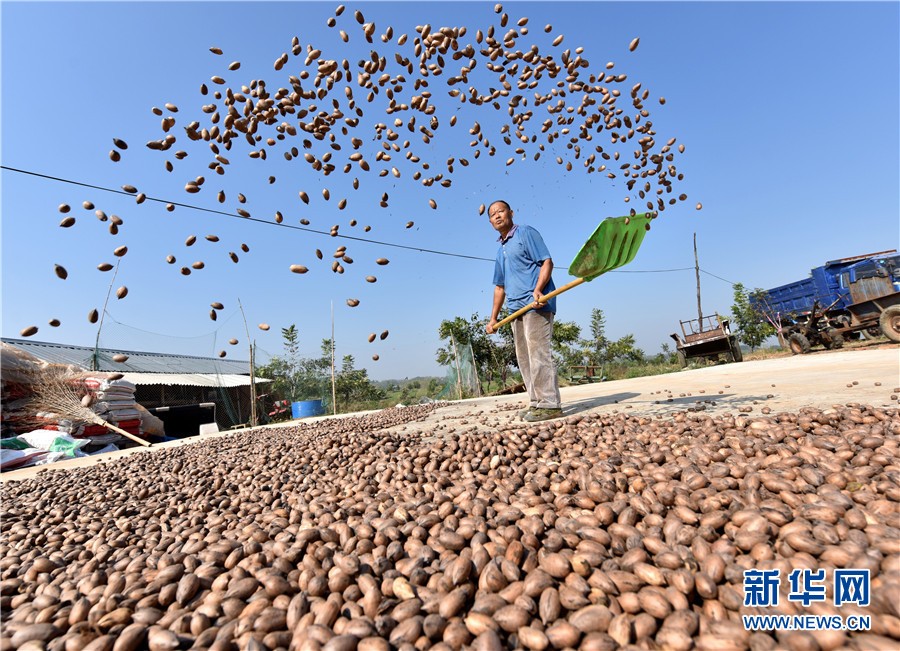 果农正在收集晾晒好的碧根果。