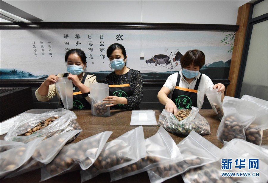 工人们正在将加工好的碧根果进行装袋。