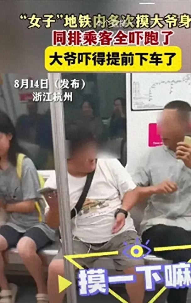 事情是这样的:8月14号那天,杭州地铁6号线上一位老年男乘客刚坐下,旁边这个短发女的就开始不老实了。先是偷瞄人家,接着就想上手摸。老大爷用胳膊肘挡了一下,谁知道这女的更来劲了,嘴里还说什么"让我摸一下嘛"。老人家被吓得赶紧起身想躲,结果又被摸了后背。最后没办法,只好提前下车跑了。