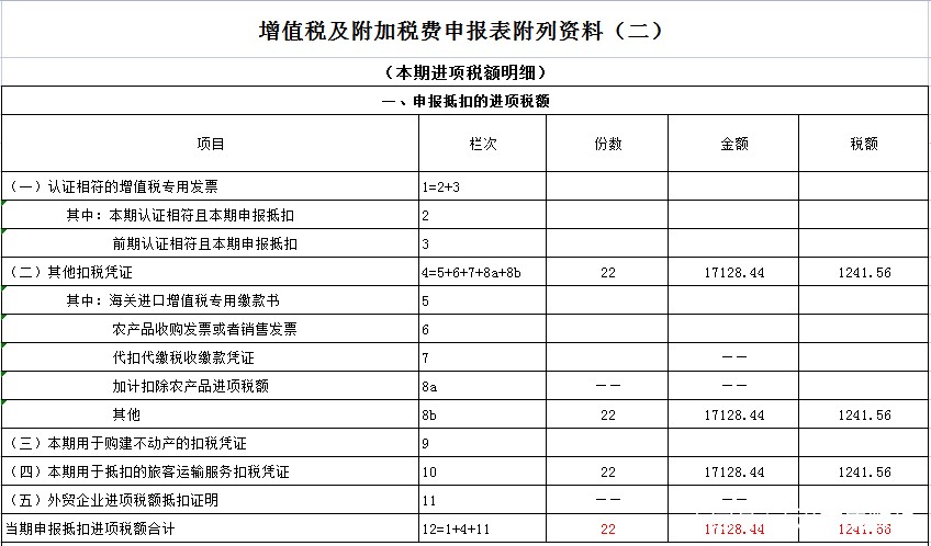 本业务《增值税及附加税申报表》所附材料,本期进项税明细;填写如下: