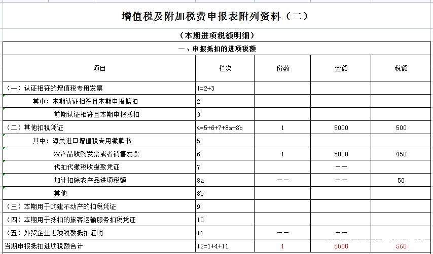 一般增值税纳税人于2021年11月从农业生产者购买苹果,支付5000元,并发放农产品购货发票。11月,所有购买的苹果均用于生产罐装苹果,罐装苹果税率为13%。对于该业务,增值税和附加税申报表所附的数据;本期进项税明细;填写以下内容: