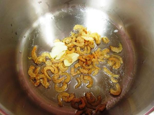 (2) 取一个有深度的锅子,热油爆香虾米和蒜瓣。