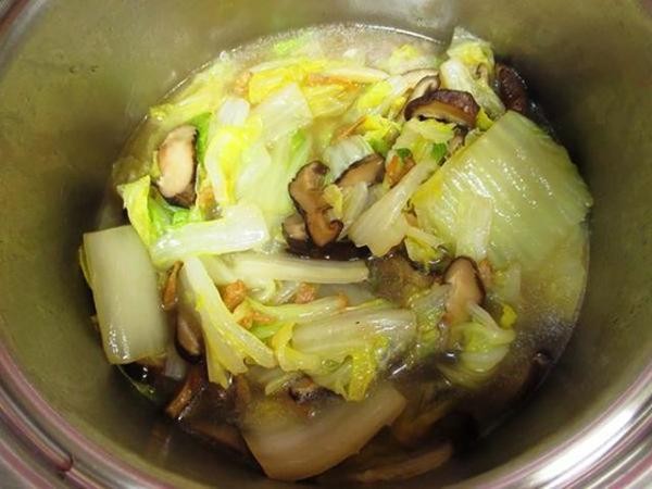 (4) 放入白菜、香菇水、盐和米酒(去虾腥用,可省),盖锅盖焖到白菜出水软化。如果白菜不够甜,另可加少许糖提味。