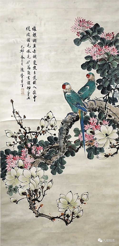 款识:绿襟缃翼赤栏东,双立双栖入画中。纵炫羽毛休见妒,为能言语却争工。己卯春三月,陈季半丁
