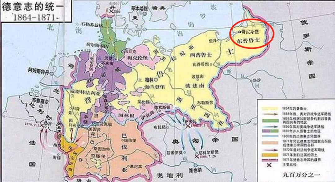 1864年至1870年间,普鲁士王国先后通过普丹战争、普奥战争、普法战争三次王朝战争,完成了德意志统一。1871年,德意志帝国诞生,位于东普鲁士的哥尼斯堡也就自然成为了德国国土的一部分。