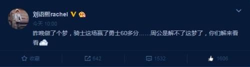 今天上午女神刘语熙放话了,她昨晚做了个梦,骑士第三战大胜勇士60分。网友纷纷惊叹,天灭骑士啊,勇士已经率先使用刘语熙了。“乌贼刘”绝非浪得虚名,她曾经在世界杯百战百挂,一举成名。