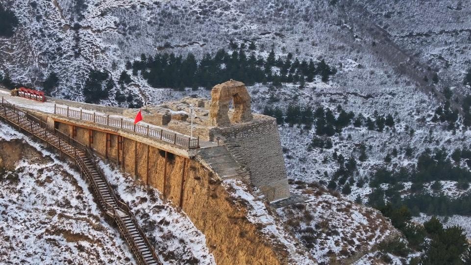 近日,雪后的朔州市山阴县广武长城呈现出沧桑壮美的独特景观。广武长城披上了一层银装,从空中俯瞰,宛如巨龙横亘山间,气势恢宏,沧桑古朴。