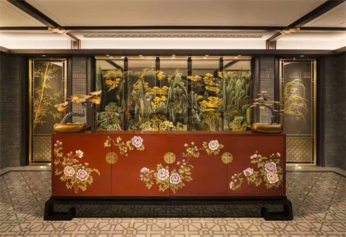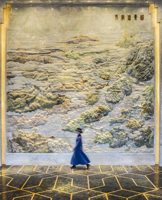 位于41层的酒店空中大堂的川蜀文化玉雕展现“天府盛景图”。这幅“天府盛景图”由三幅独立玉雕组成,分别呈现了青城山、望江楼以及都江堰的绝美风光。