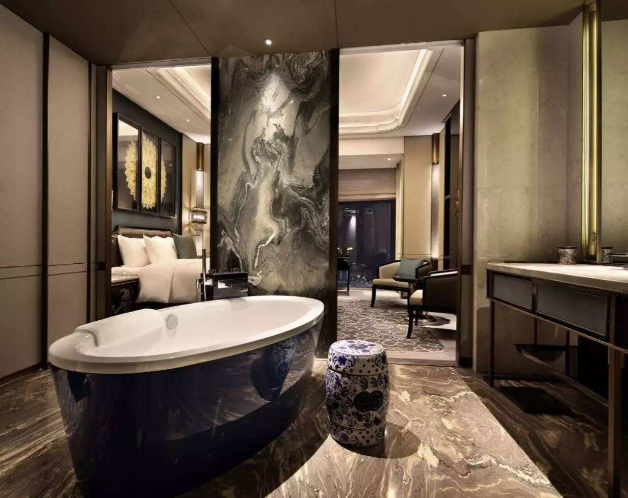 主要位于32-37楼的现代中式风客房以芙蓉花,流苏,灯笼等经典川派元素,演绎浓郁的成都特色。配合东方黄铜系列元素的融入——向宾客呈现东方元素的时尚新演绎。独立的淋浴和浴缸配以镀金的卫浴设备、智能马桶以及防水镜面内嵌电视带给宾客非比寻常的洗浴体验。
