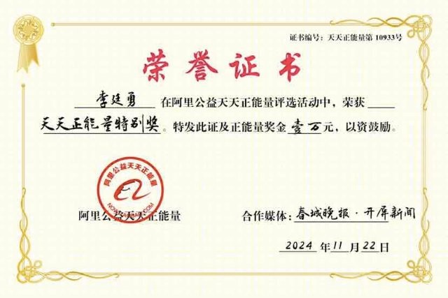 阿里公益天天正能量联合春城晚报-开屏新闻,授予李廷勇“正能量特别奖”及奖金10000元,并写下了这段感人至深的颁奖词: