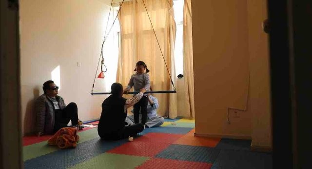 李廷勇和妻子李芳陪女儿做康复训练