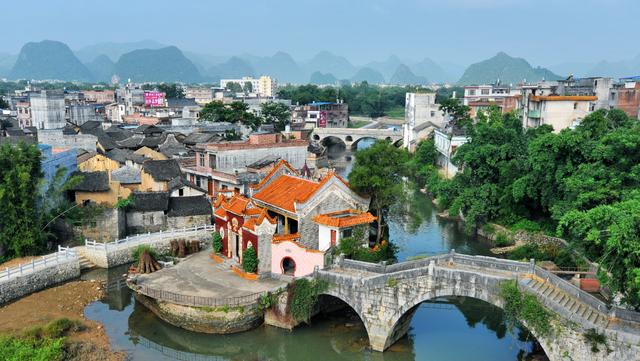 黄姚古镇发祥于宋朝开宝年间(972年),为典型的喀斯特溶岩景观。古镇内300多间明清宅院,岭南风格极其浓郁。古街按九宫八卦阵势布局,一条主街延伸出八条弯弯曲曲的街巷,宛如一大迷宫。三条溪河蜿蜒穿行在古镇之中,古民居的静态于流水的动态自然的结合,共同构筑了一幅“小桥、流水、人家”的绝世美景,其独特的景致与江南众多水乡不尽相同,古屋,古榕,奇石和小桥流水交相辉映,俨然一个“人与自然完美结合的艺术殿堂”。